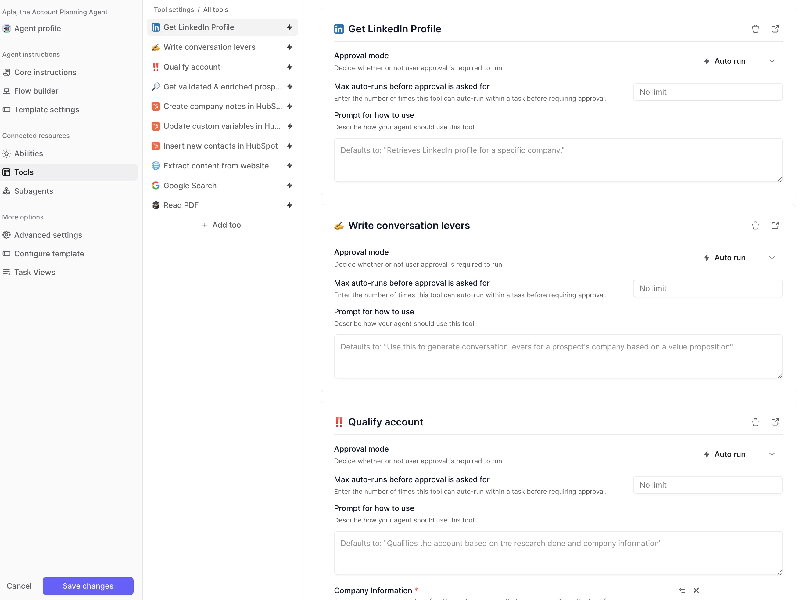 We recommend that you set high-risk tools, especially customer facing actions, to "require approval" until you're happy with how your agent is performing. Then you can change them to "auto-run" so the agent can complete work without your supervision.