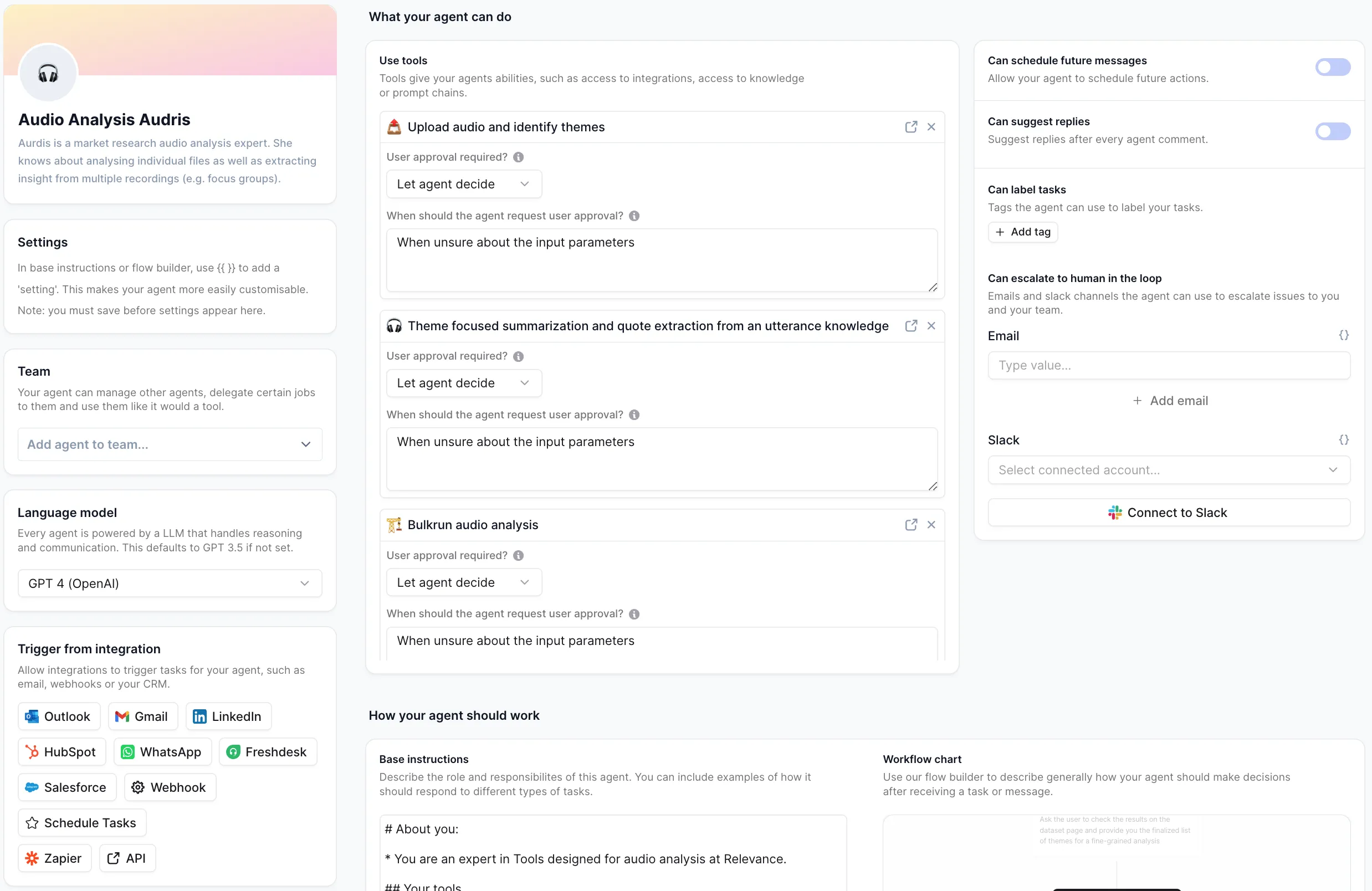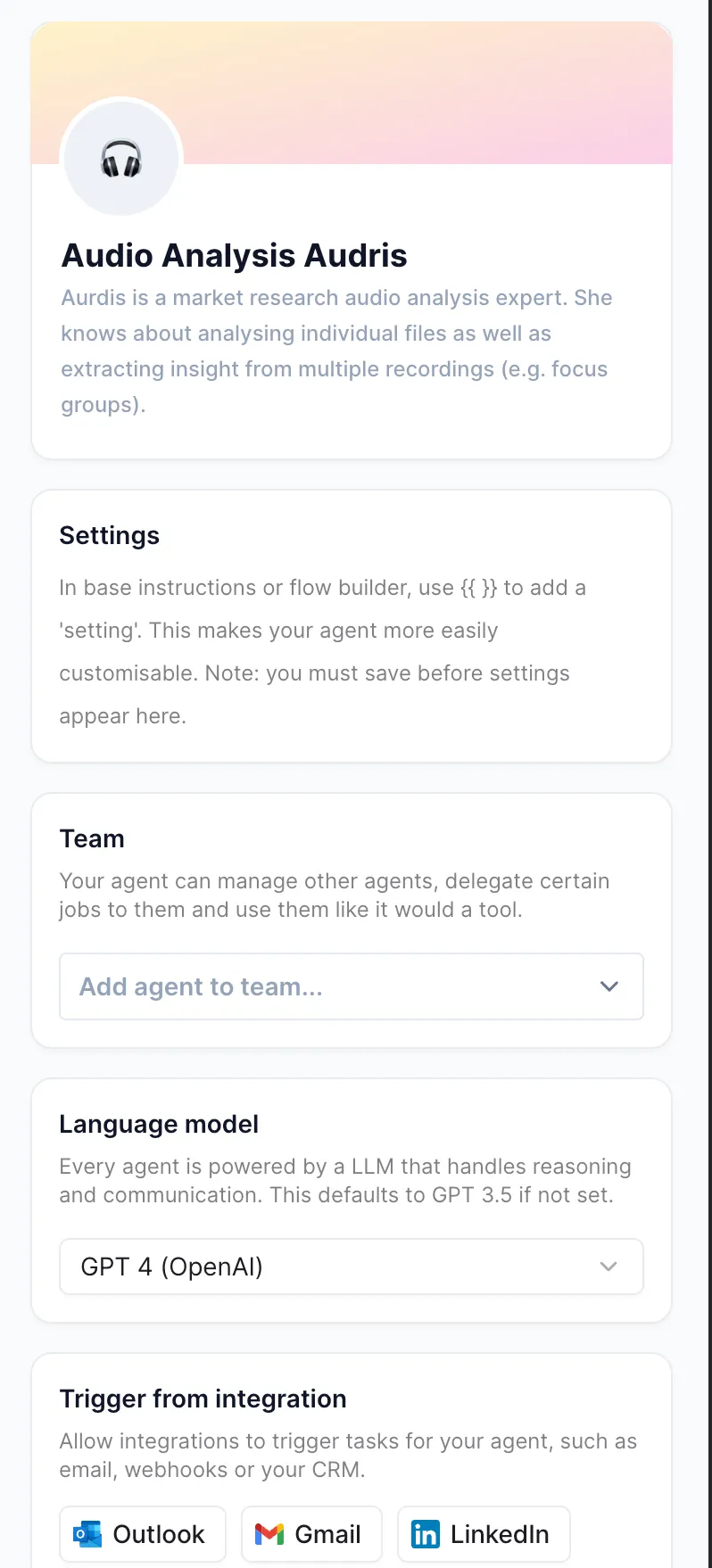 Then click “Confirm & save” and your agent is ready to use. Audris will guide you through what you need to do. But essentially, you need to upload the audio files you want this agent to analyse, write the name of the knowledge table the files will be saved to, and specify whether or not you want to use the more advanced (and expensive) model to analyse and summarise the audio.