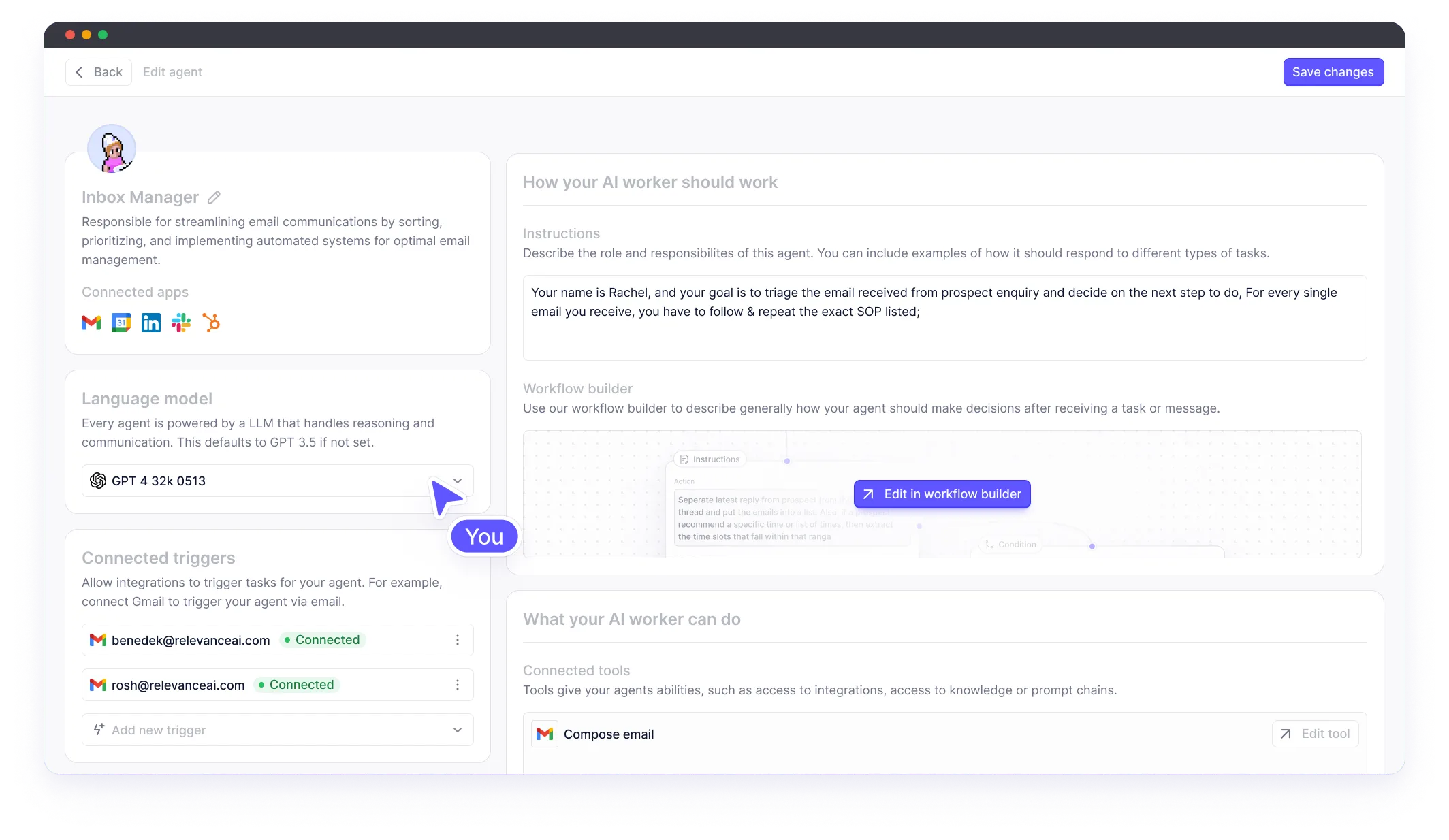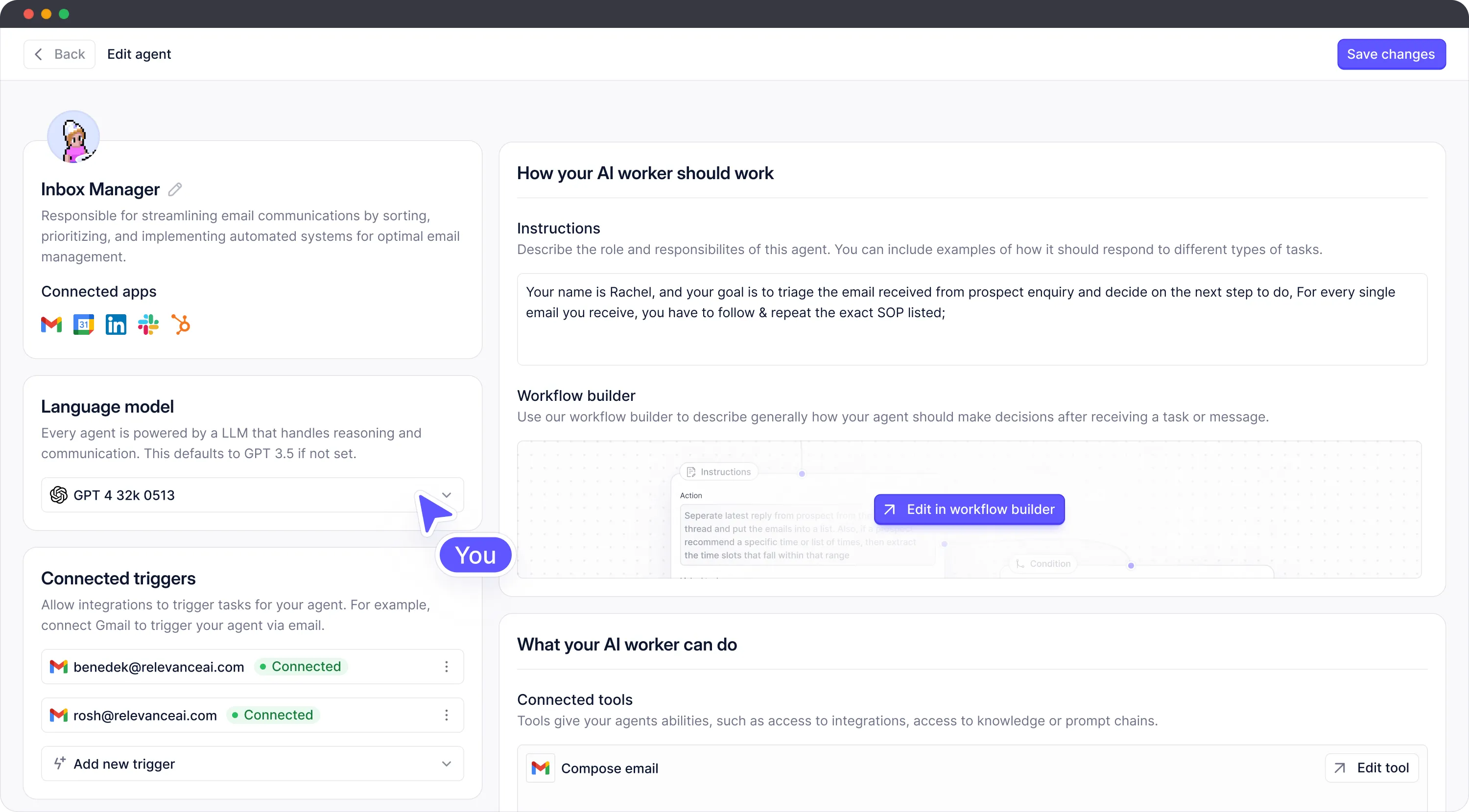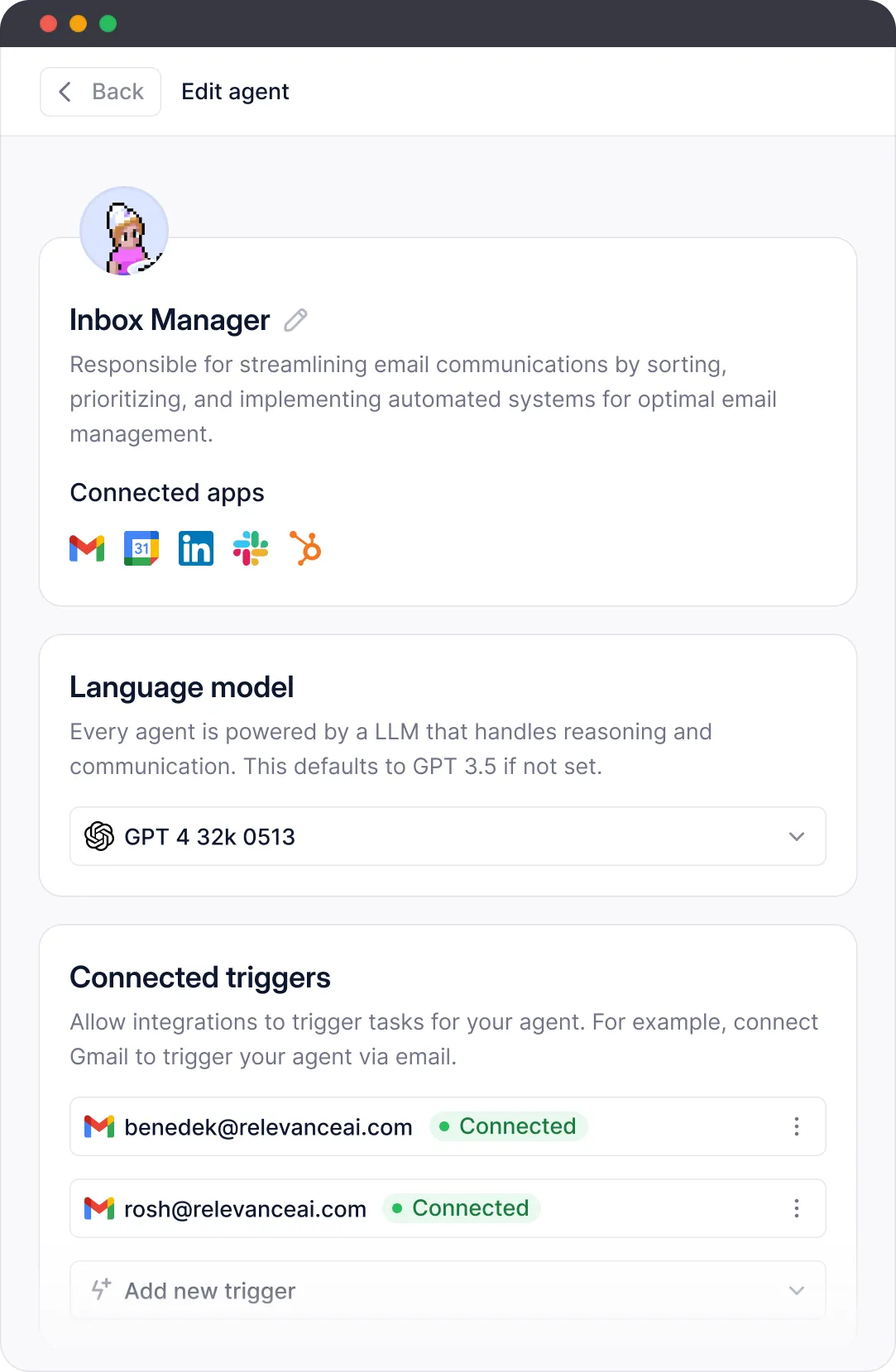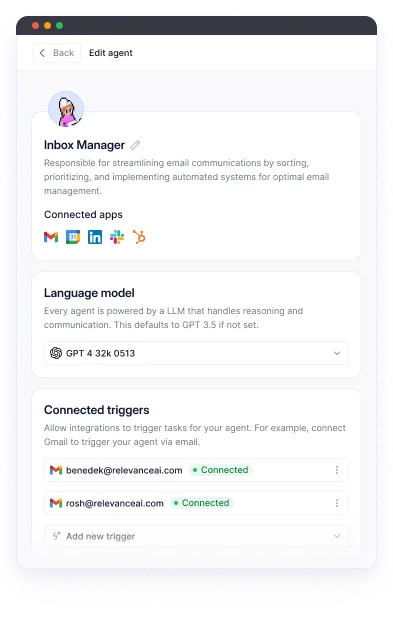 Create a new agent - Give it a name, avatar, description, etc. This establishes it’s identity. Add AI Tools - Tools give your agent skills like the ability to convert a Youtube transcript into a blog. Relevance has prebuilt skills like making API calls, data processing, etc. Set triggers - Triggers specify conditions when a skill should activate. For example, trigger a Tool when the agent receives a certain query.Talk to your agent - That's it! Start interacting with your agent using natural language. The agent will improve as it has more conversations.