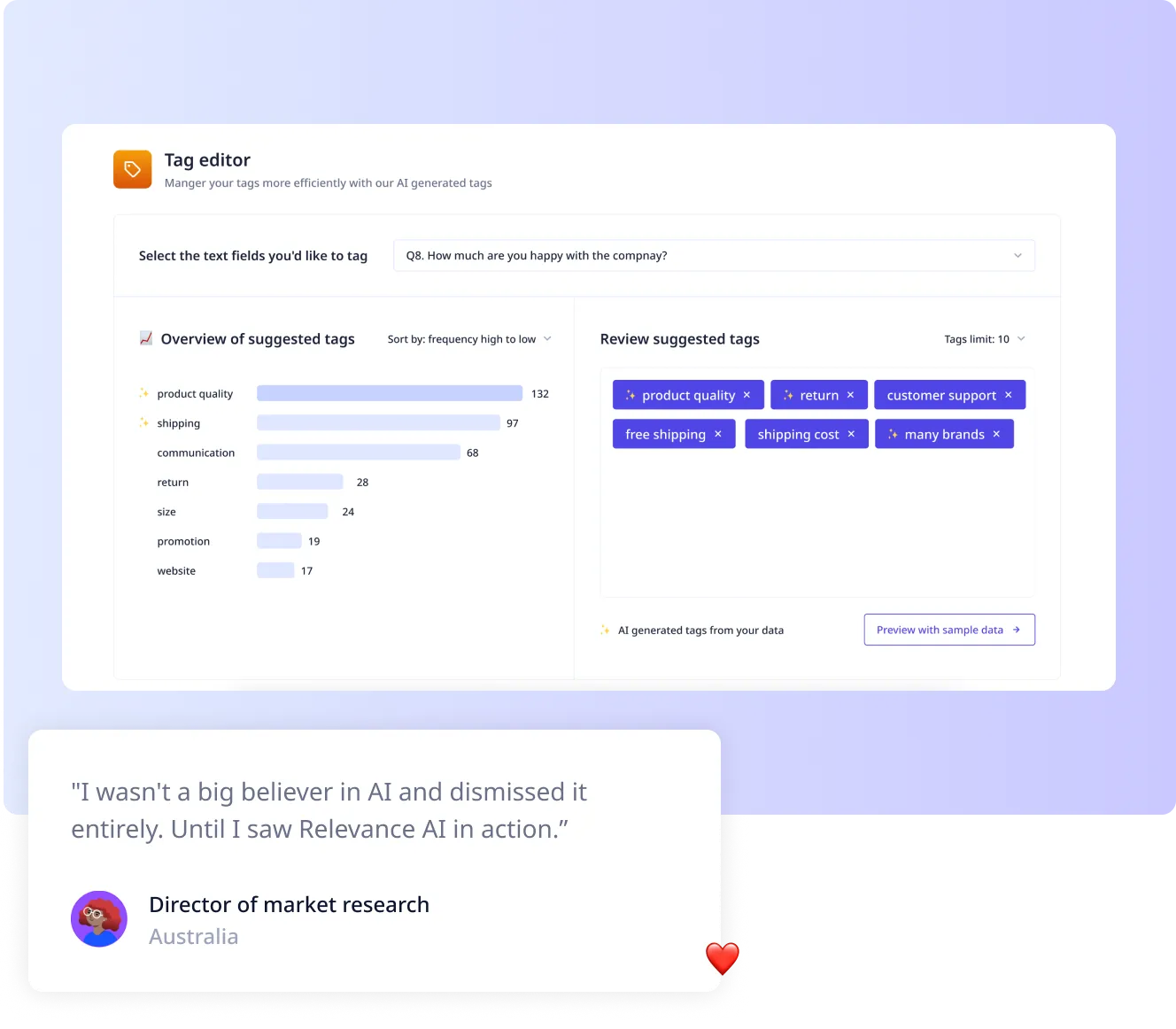 Today’s approach to uncovering customer insights is slow, manual, expensive and inefficient. Relevance AI is the fastest way to analyse customer feedback data at scale. From any source for actionable insights and drill-downs.