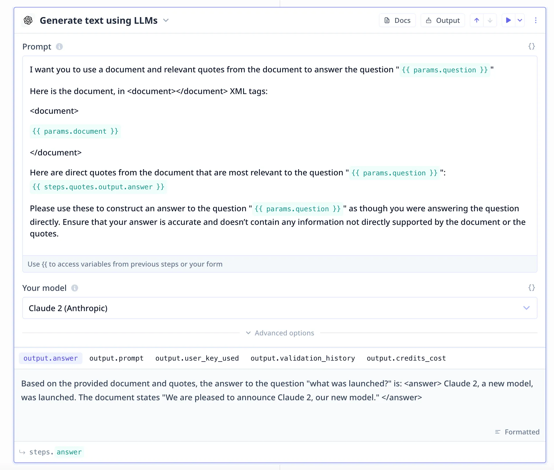 The other major benefit of prompt chaining is that you can take sequences of prompts you might usually do ad-hoc with assistants like Claude and turn them into shareable LLM apps. These apps can then be used to have a consistent output each time you run them and save you time not having to copy-paste prompts back and forth as you build out the use-case.
