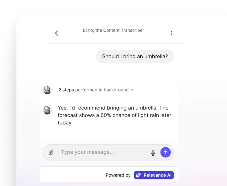 From support to sales to self-service help, Agent Chat transforms your AI agent into a smooth, branded experience your users can talk to—anytime, anywhere.