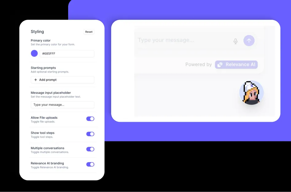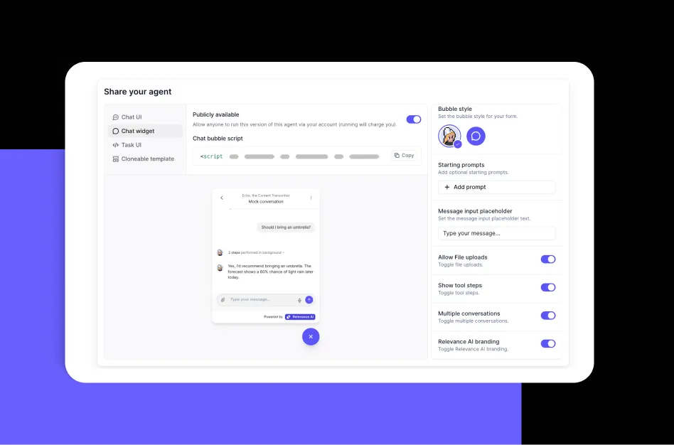 Embed your agents on your website or share them via a link—Agent Chat creates a sleek, intuitive chat interface that makes it easy for users to talk to your agents in real-time.