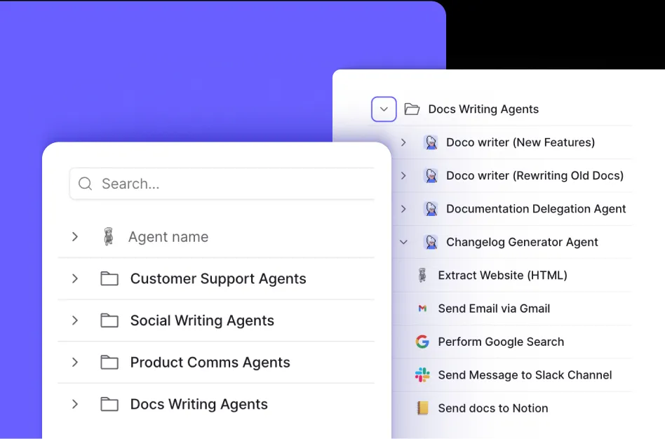 Use folders for quick sorting, and projects to group related agents and workflows. Drag and drop, rename, or archive anytime—no mess, no stress.