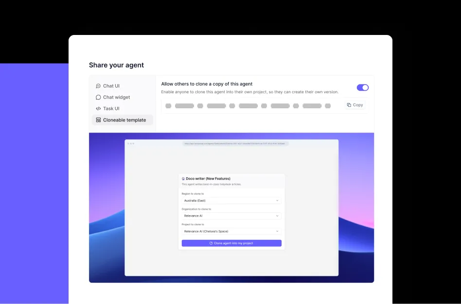 Let others build on your work by sharing agents as templates or embedding them into apps and workflows. You stay in control of access, usage, and updates—every step of the way.