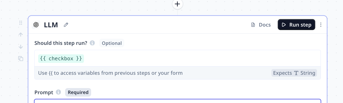 Click on the three vertical dot on the top right of the step and select “Add conditions”. See the full guide at Adding condition to a step.Why do I have to use single or double quotations around variables in my prompts?