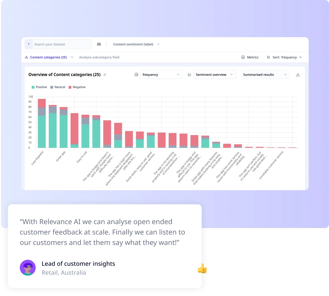 Drag and drop any text or audio data from multiple sources. Or set up a connection with our pre-built integrations. Slice and dice the data, building customizable charts, reports and dashboards.