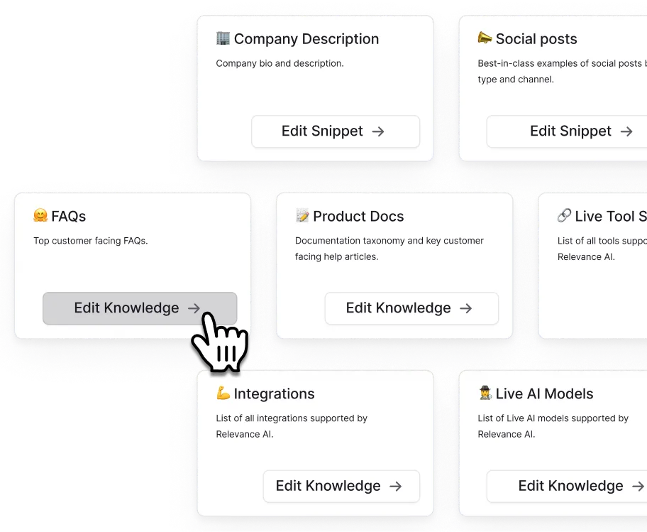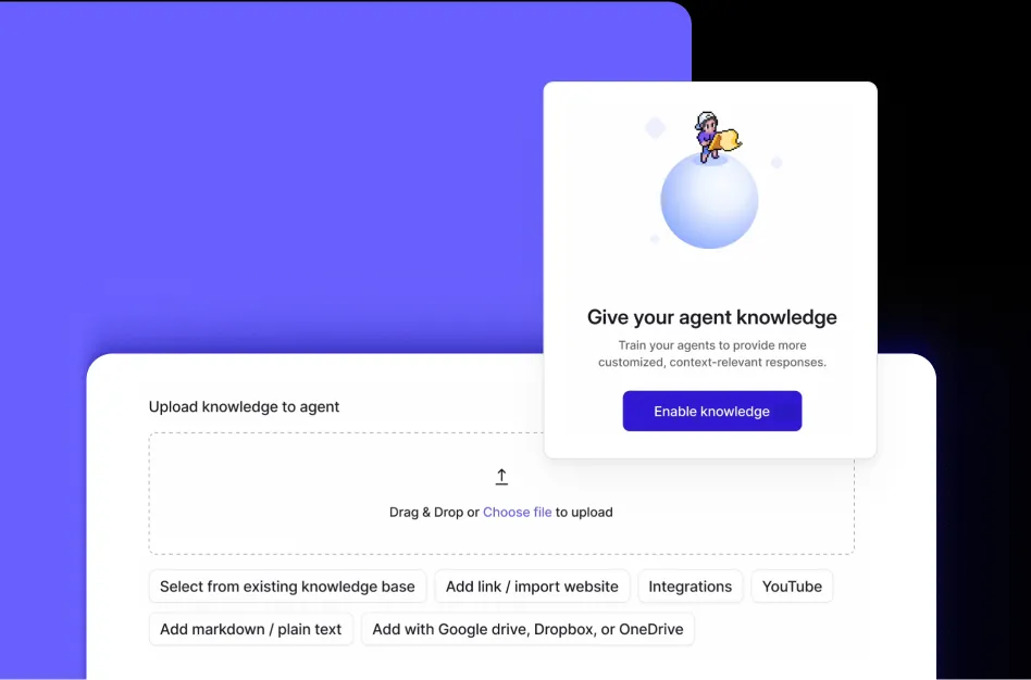 Train once, reuse everywhere. Apply your Knowledge Base to multiple agents and tools with a click. Update it once, and every agent stays in sync—no rebuilds, no retraining.