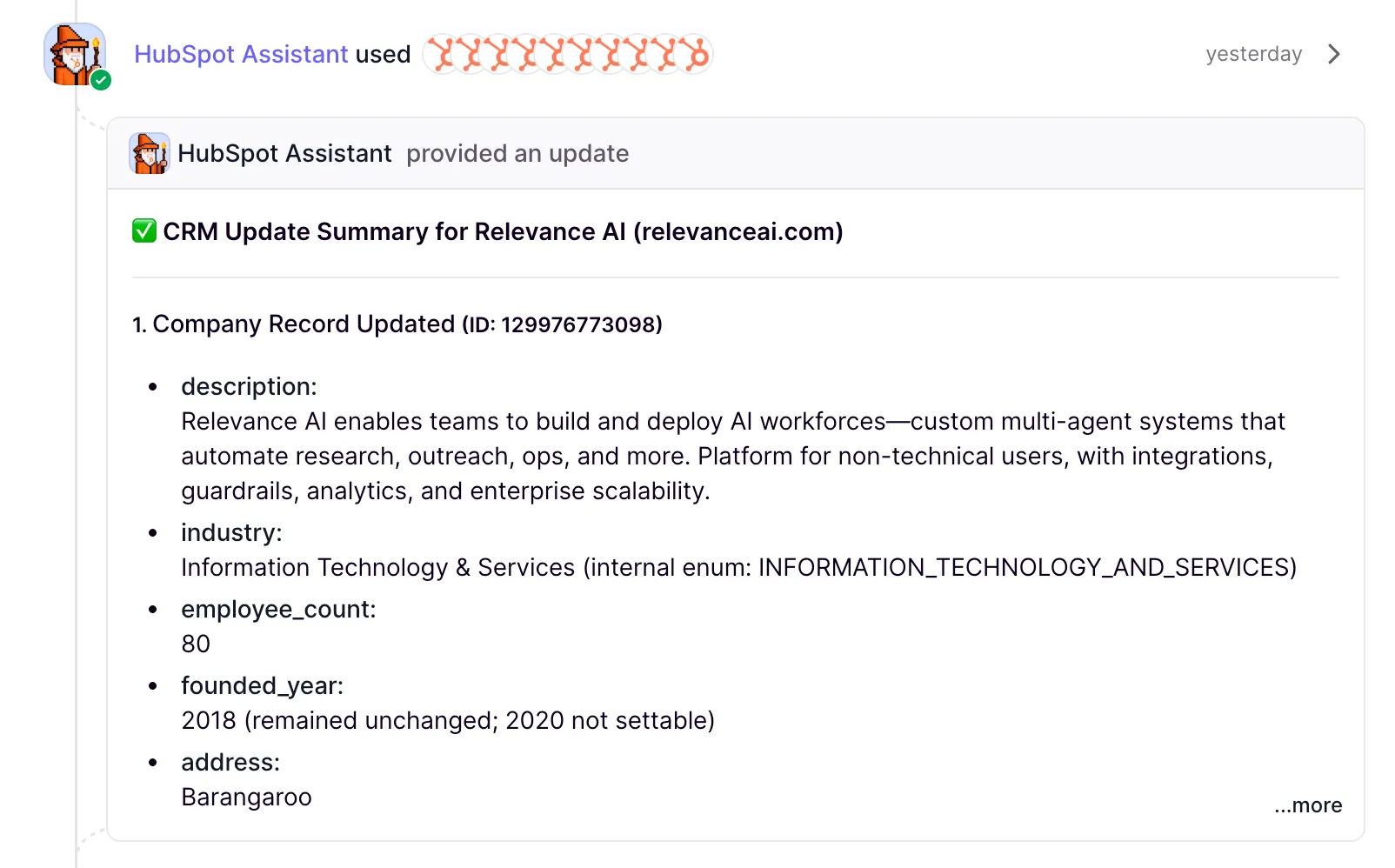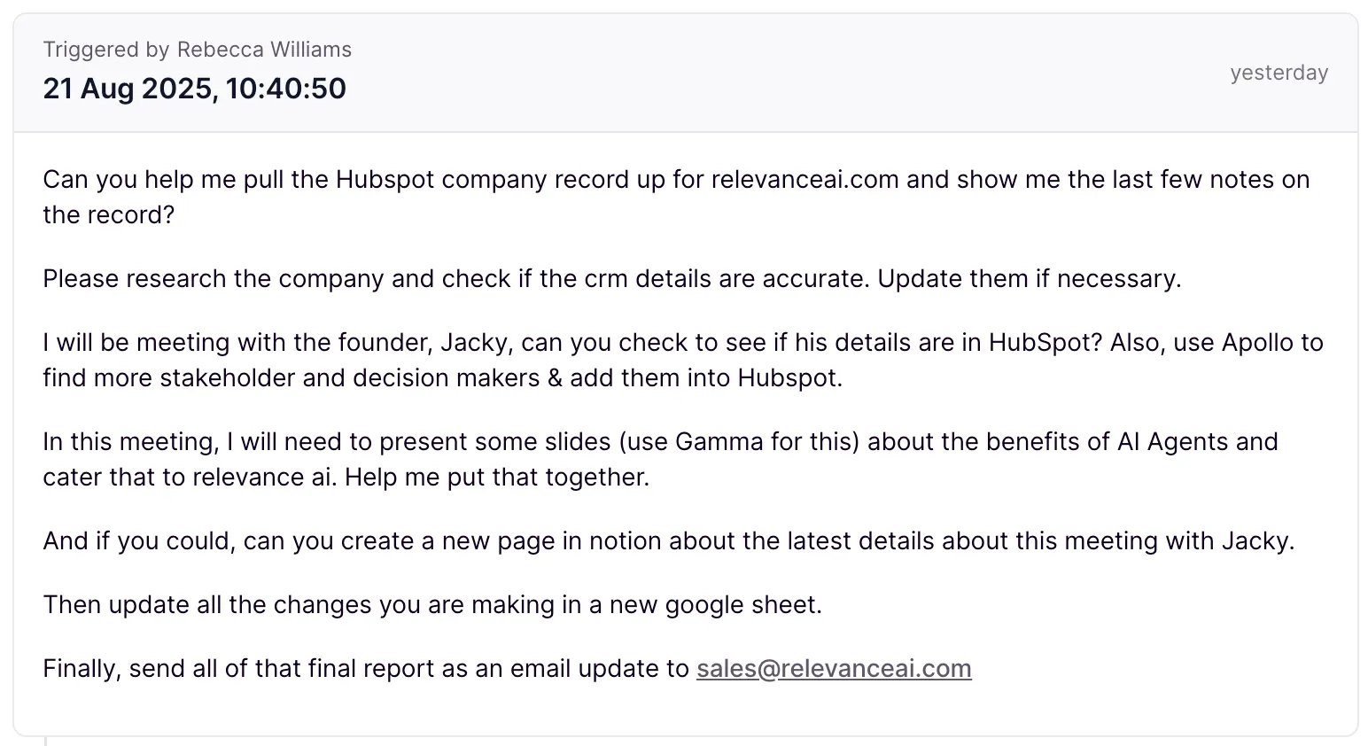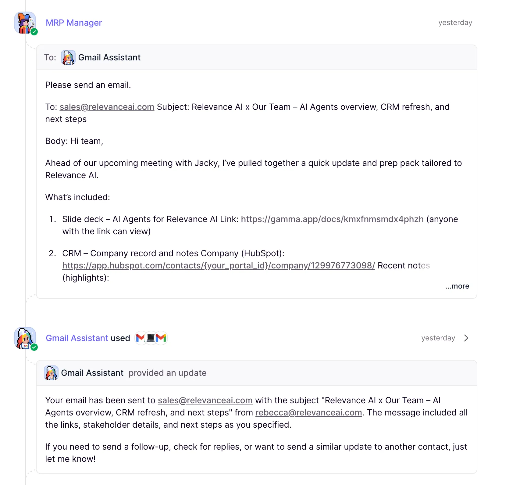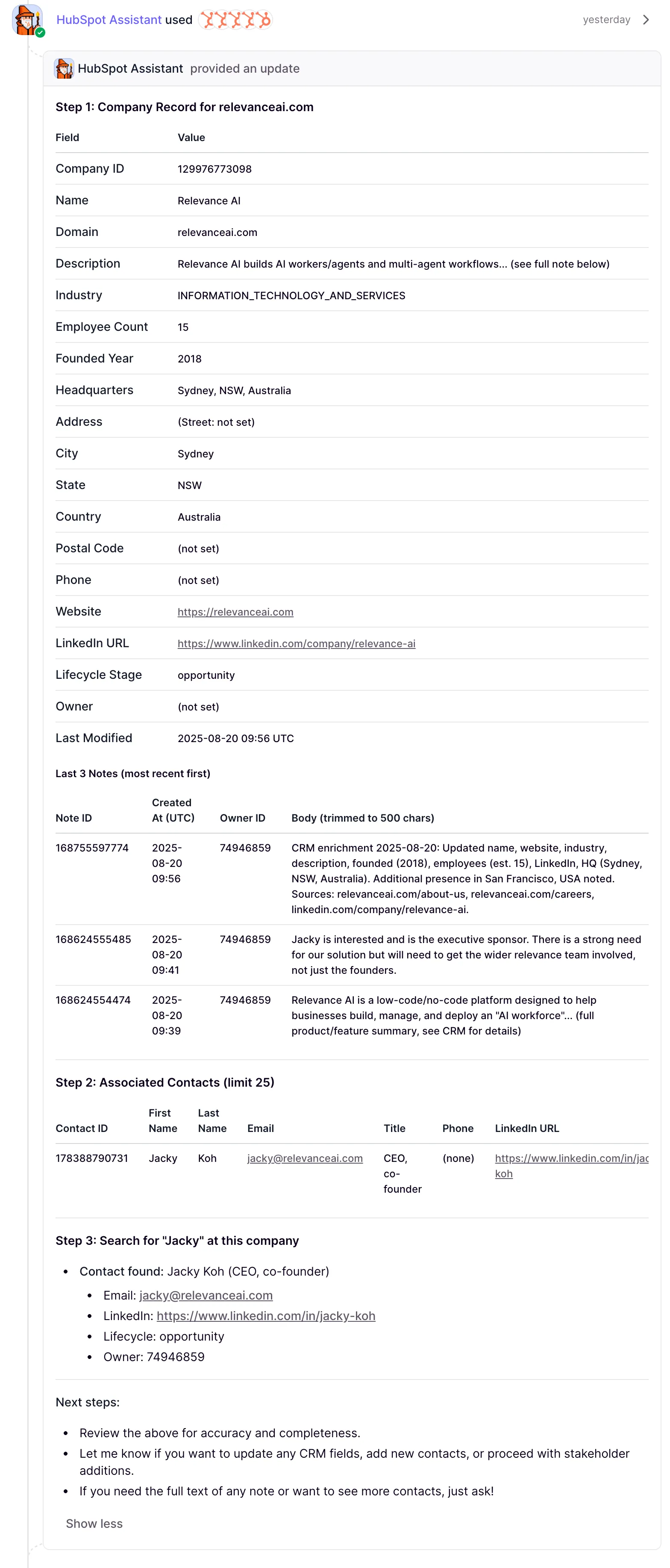 Then the MRP Manager asked the HubSpot assistant to retrieve all of the records in HubSpot that are related to Relevance AI, it's founders, engagement history and key stakeholders.