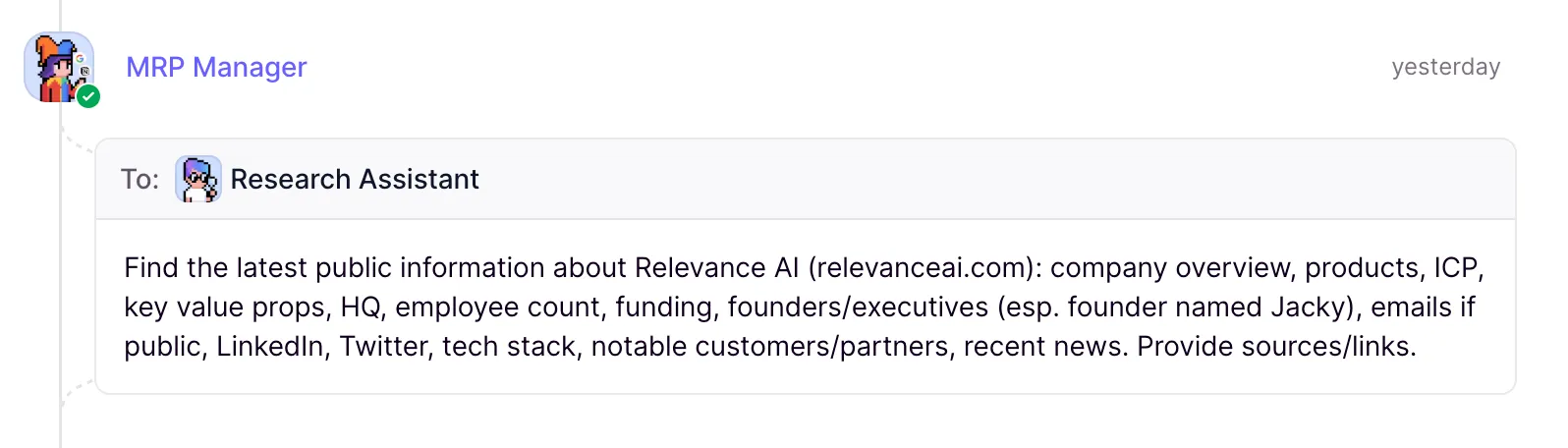 The MRP manager started by delegating to the research assistant to find out everything it could about Relevance AI, using two simple tools: Google Search and Extract Website Content.
