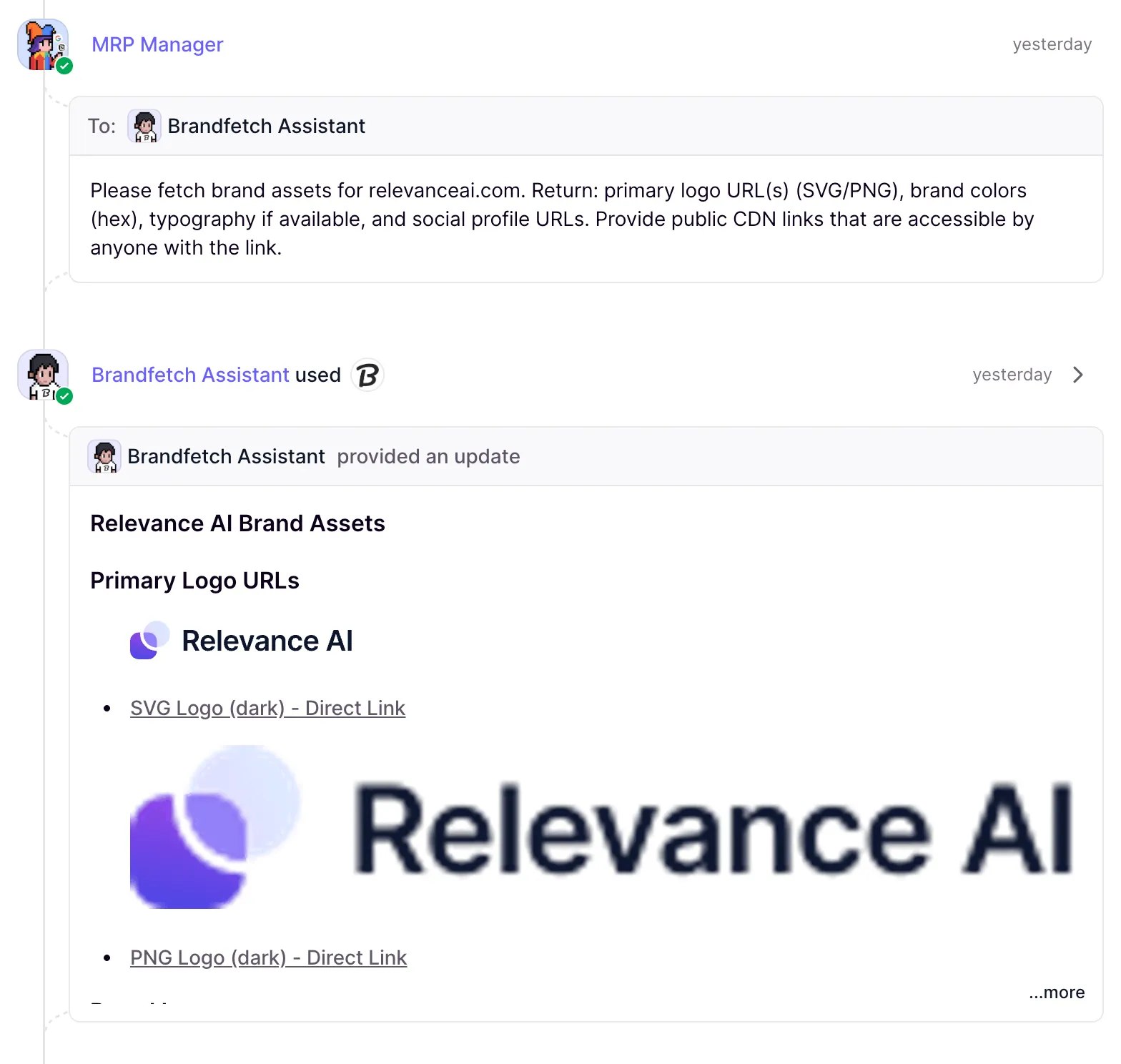 Next, the MRP manager asked the Brandfetch assistant to fetch all of Relevance AI's brand assets. It found logo files in different formats, brand colour codes, social profiles and more.