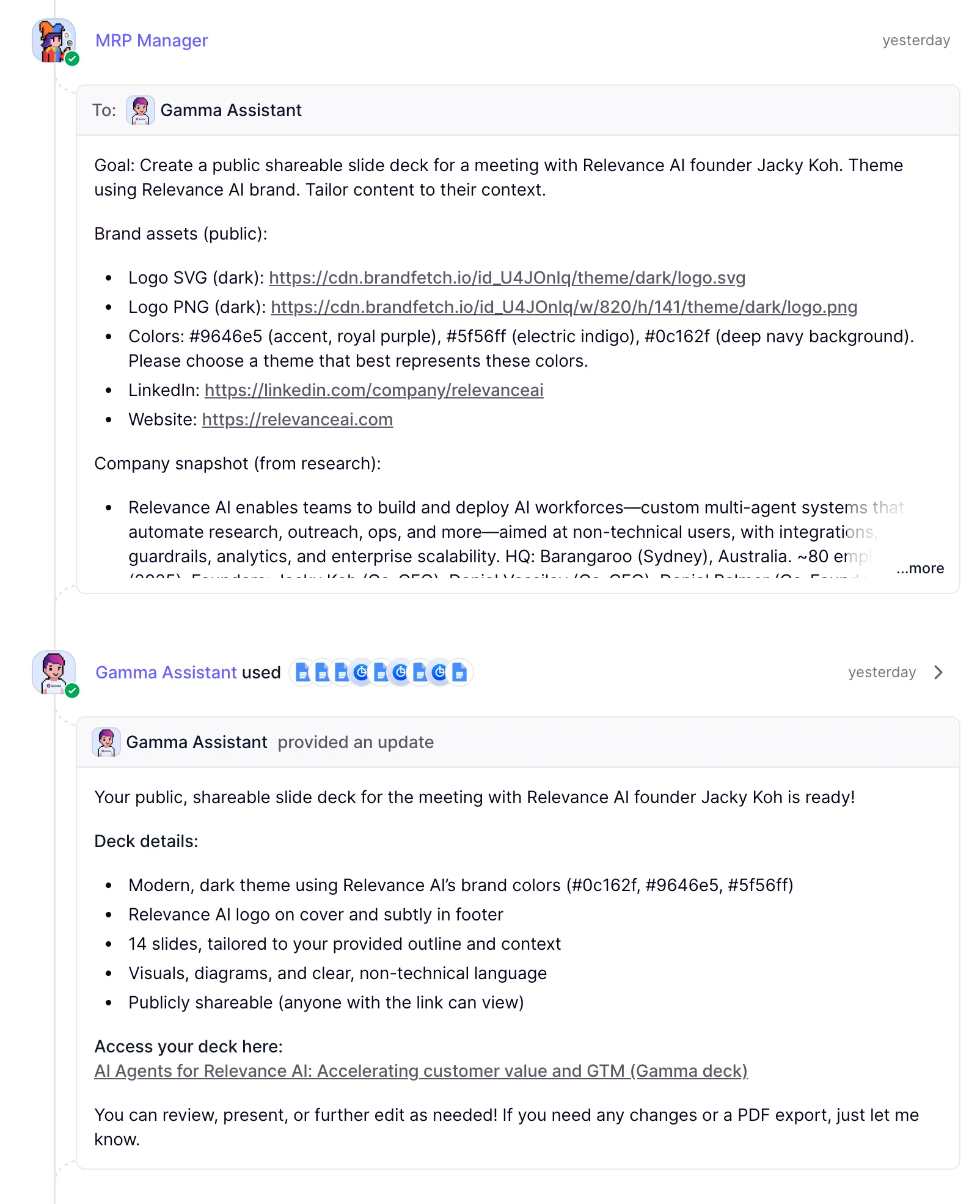 Now, the MRP agent asks the Gamma assistant to create a slide deck for the meeting with Jacky Koh, one of the founders of Relevance AI. It asked it for 14 slides, with a mix of visuals, diagrams and non technical language.