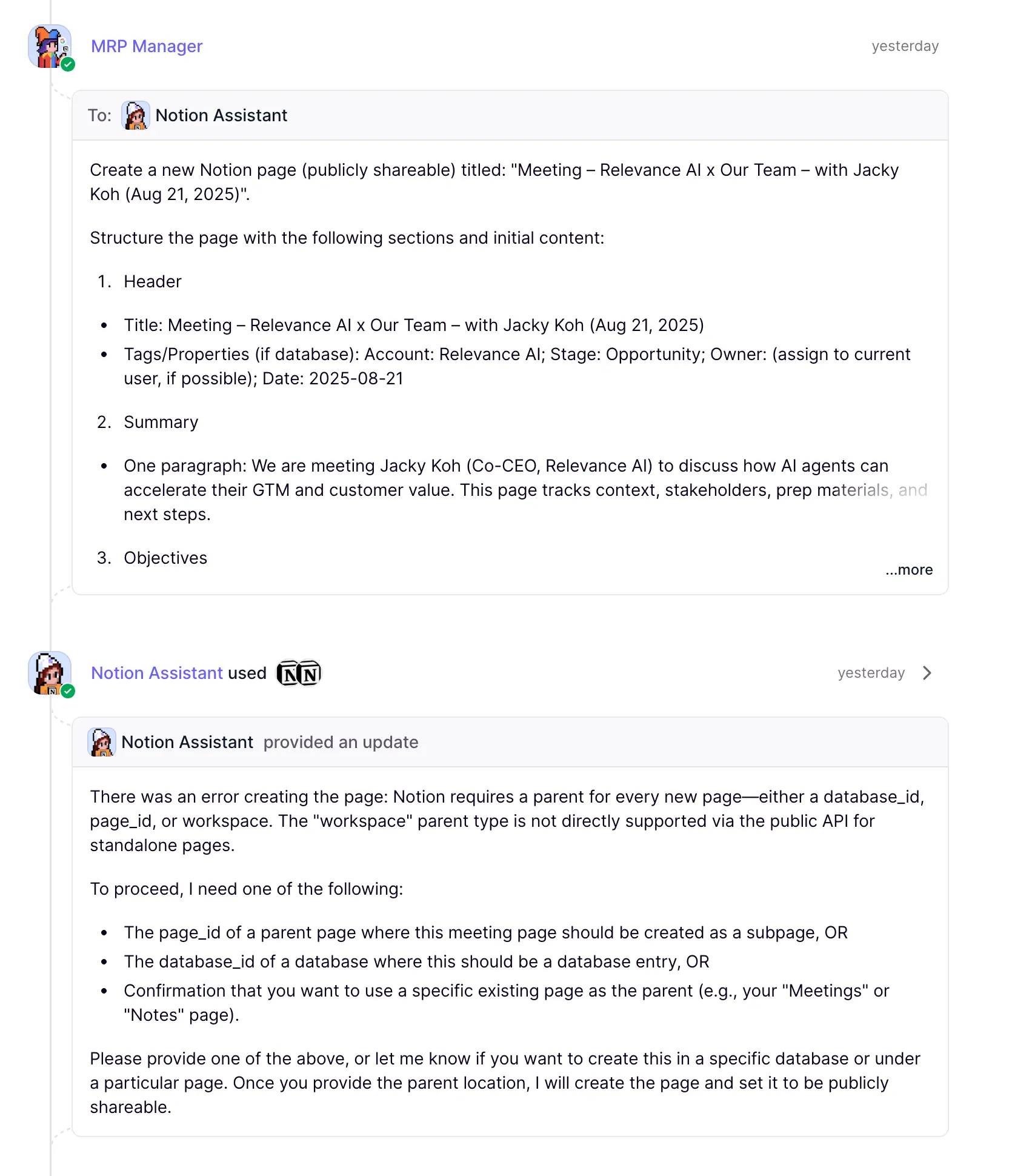 Next, the MRP agent delegates to the Notion assistant, to create a page in Notion to prepare all of the latest details about Relevance AI ready for the meeting. The Notion Assistant failed in this case, because it required a page ID. It didn't stop working though. It carried on and finished the rest of its objectives.