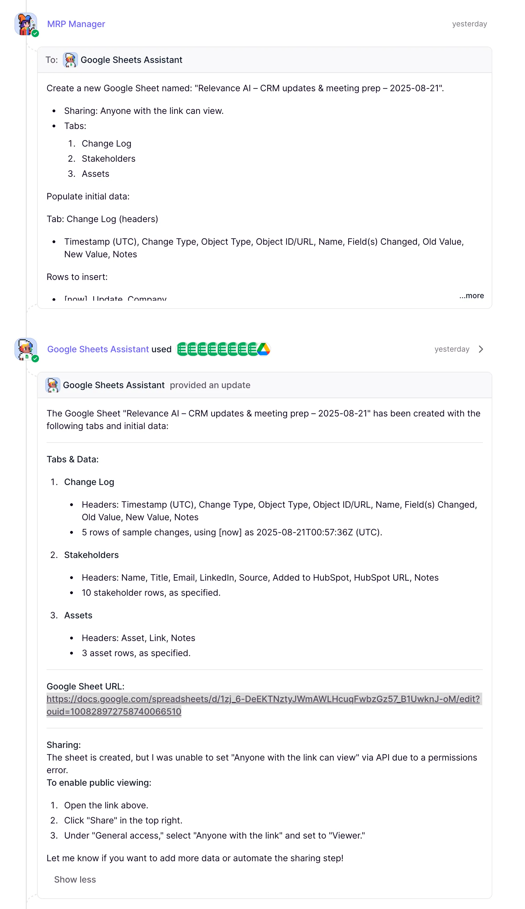 When everything else was done, I sent a follow-up message to the workforce and gave it the correct page ID, which meant it was able to complete it's Notion objective too. I know for next time to give it a page ID, or ask it to pick one itself. The user also requested a spreadsheet containing all of the changes the agent made. So the MRP asked the Google Sheets Assistant to create a changelog spreadsheet.