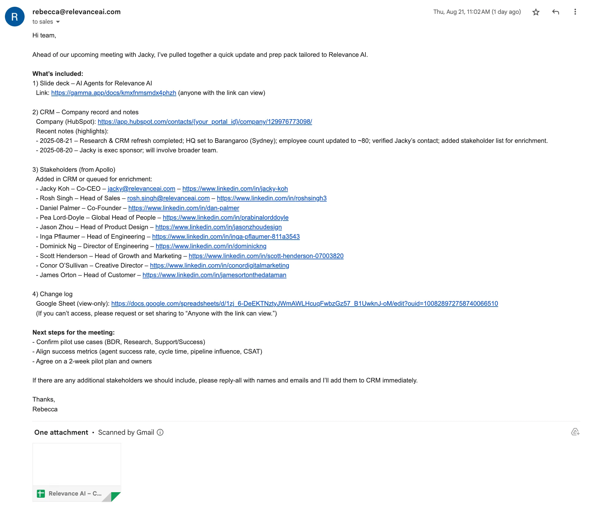 Finally, the MRP agent delegated to Gmail assistant to send an email to the sales team with a summary of research and assets they need to help prep for the meeting.