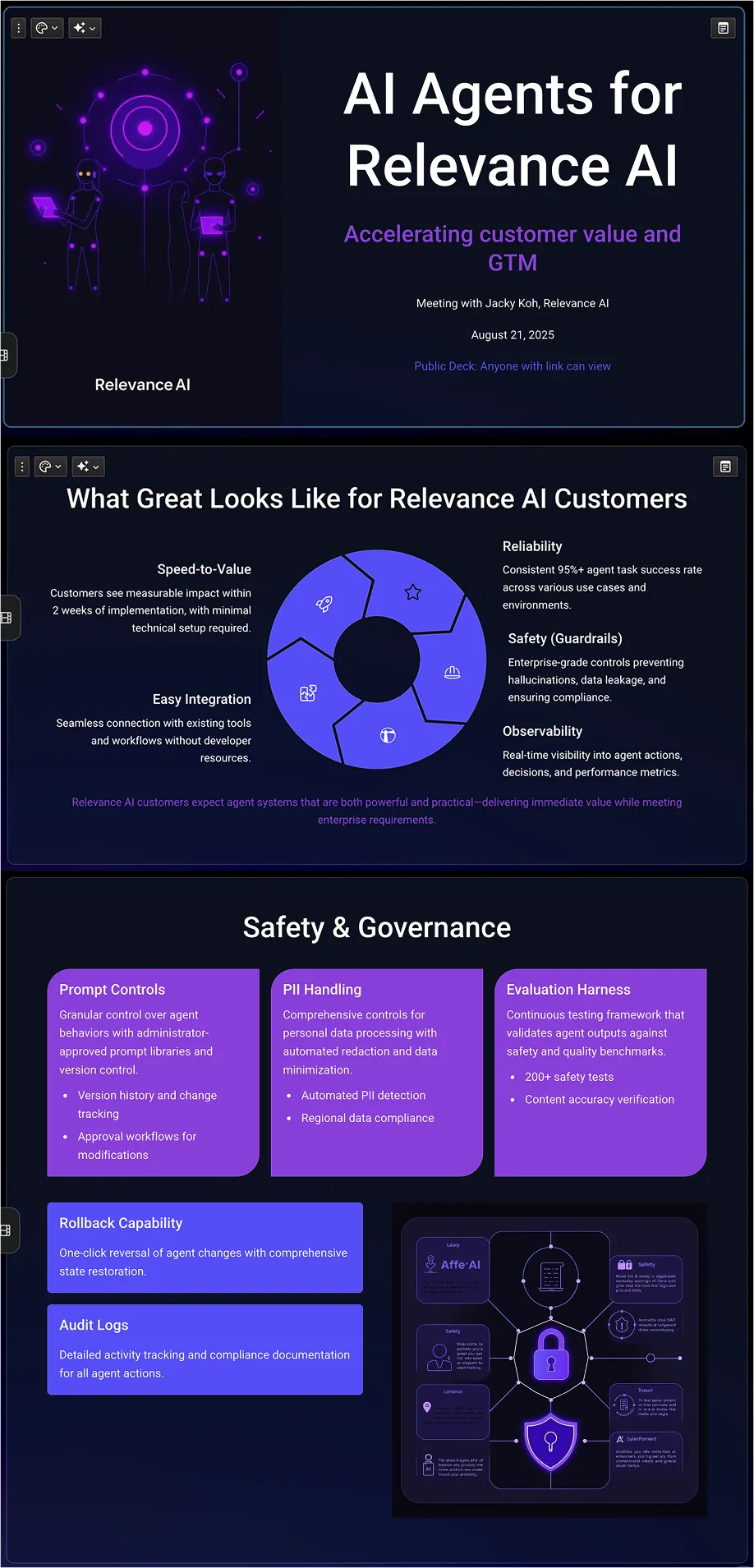 Here are some of the slides in the 14-paged slide deck it created. Gamma is amazing. With that, the users third request for a slide deck that communicates the benefits of AI agents and cater to Relevance AI is complete.