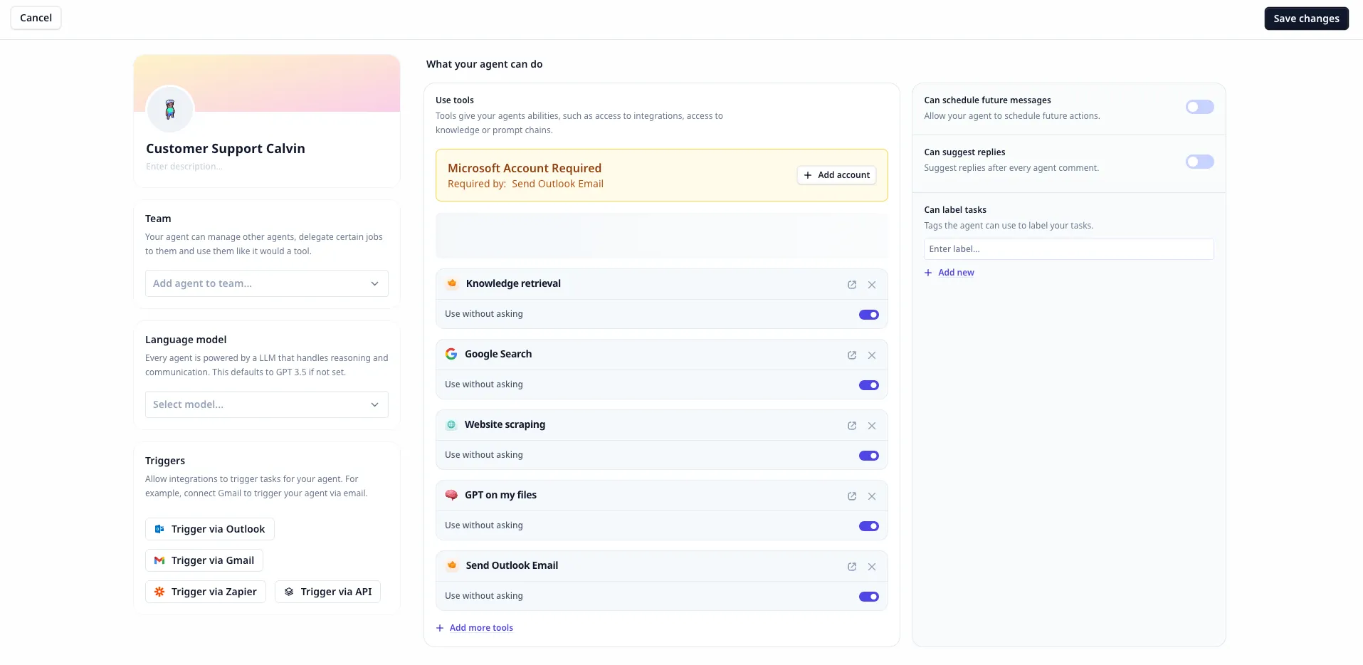 To figure out which connections are missing, you can view any required integrations for your agent at a glance in one centralized location, bringing all external authorization requirements straight to the edit agent page with helpful notifications.
